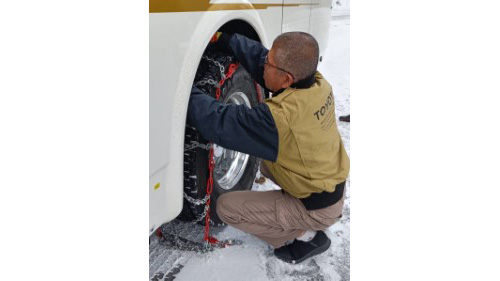 本研修では、現地へ向かう車内において、雪道走行時の注意点やタイヤチェーンの装着方法について動画を用いた座学研修を行いました。到着後は、実際にタイヤチェーンの装着作業を行い、雪上走行および登坂走行の実地研修を実施しました。